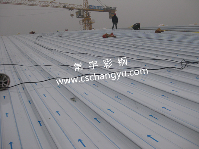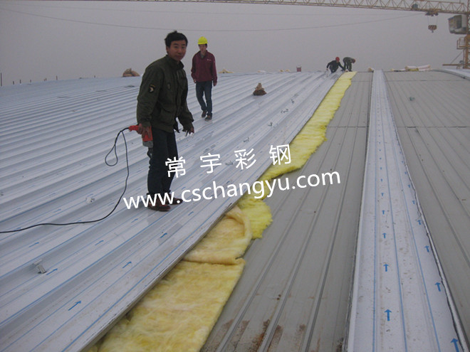 湖南外貿(mào)職業(yè)學院為網(wǎng)架結(jié)構(gòu)。鋁鎂錳板為現(xiàn)場加工,板長62.8米和40米,總計6400平方。屋面主檁條C160*50*2.5C型鋼,次檁條C100*70*2.0C型鋼,屋面底板YX15-225-900型彩鋼壓型反壓,屋面面板為YX65-430型直立鎖邊鋁鎂錳板+保溫棉+430型支架。圖為現(xiàn)場實拍鋁鎂錳板加工、安裝。